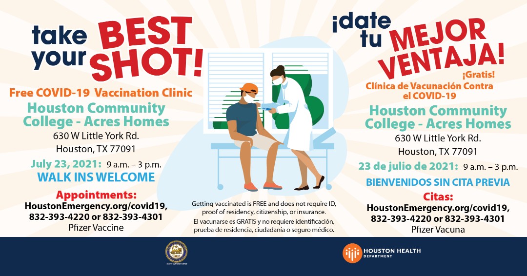 Houston Health Dept On Twitter Takeyourbestshot To End The Pandemic By Getting Vaccinated At Houston Community College Acres Home July 23rd From 9 A M To 3 P M Walk Ins Welcome And Appts Available